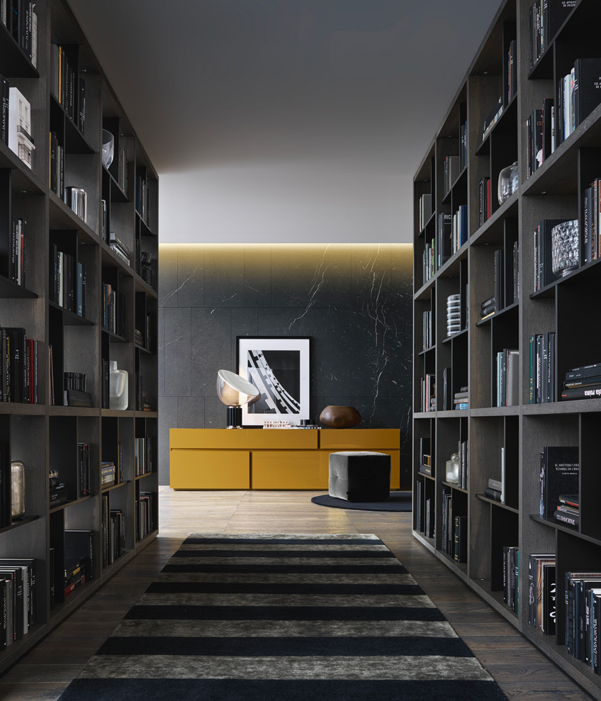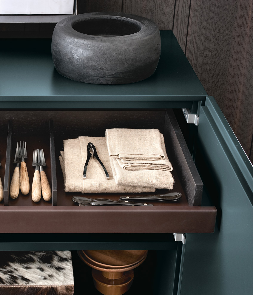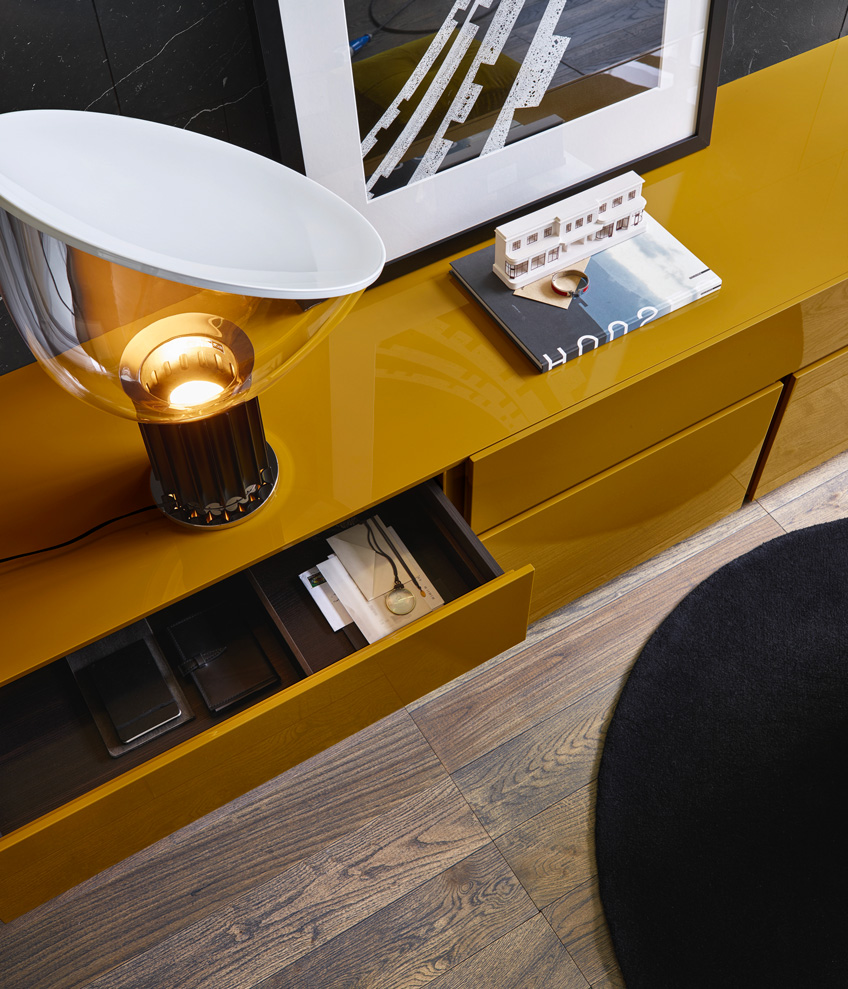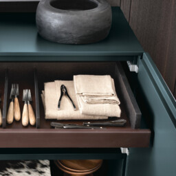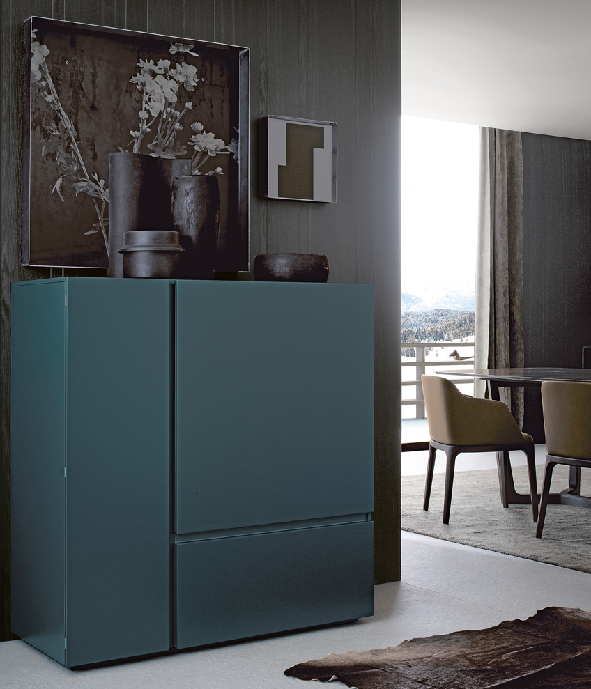 Un monolithe aux formes stylisées et géométriques façon Piet Mondrian à interpréter librement, en choisissant parmi toutes les possibilités offertes par les couleurs laquées mates et brillantes. En version haute ou basse, le buffet Free peut être équipé d’accessoires en option tels que le porte-couverts et le porte-bouteille.