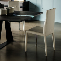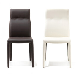 Chaise avec structure en acier, revêtement tissu, simili cuir ou cuir mince selon échantillons. Dossier flexible.