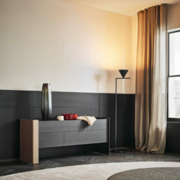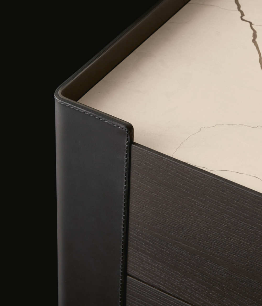Le lit Chloé est accompagné d’une série d’accessoires inspirés du design particulier de la tête de lit repliée vers l’intérieur. Dans les tables de chevet et la commode Chloé, les côtés d’appui en métal recouverts de cuir se transforment en un détail emblématique qui conquiert par sa légèreté et sa personnalité.