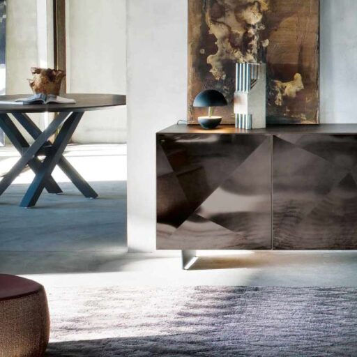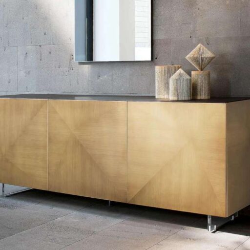 Superbe buffet moderne avec façade et côtés en relief réaliseés en inox satiné et plateau supérieur en placage de chêne teinté noyer d’Amérique.