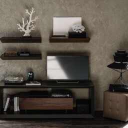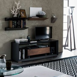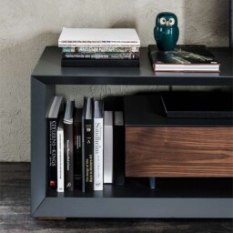 Meuble porte-TV avec structure en laqué gaufré blanc (GF71) ou graphite (GF69). Tiroirs en noyer Canaletto (NC), laqué gaufré blanc (GF71) ou graphite (GF69) mat. Portes en noyer Canaletto massif (NC). Version 160 avec porte à abattant, version 200 et 250 avec porte à abattant (G) et tiroir (D).