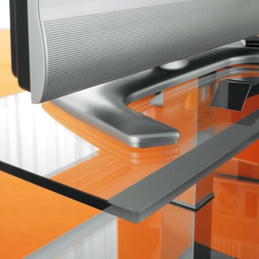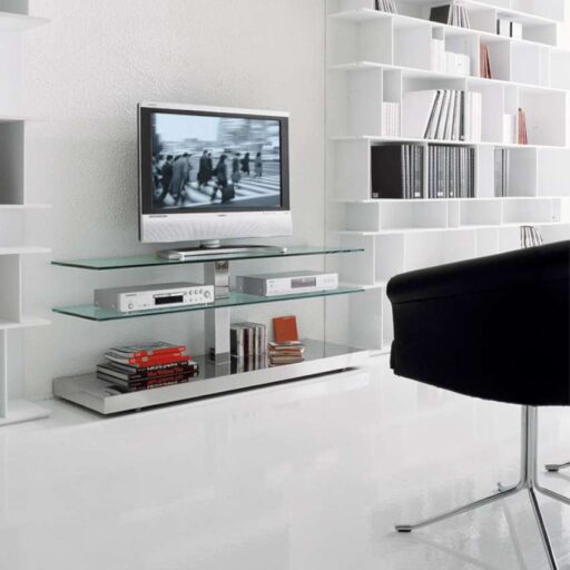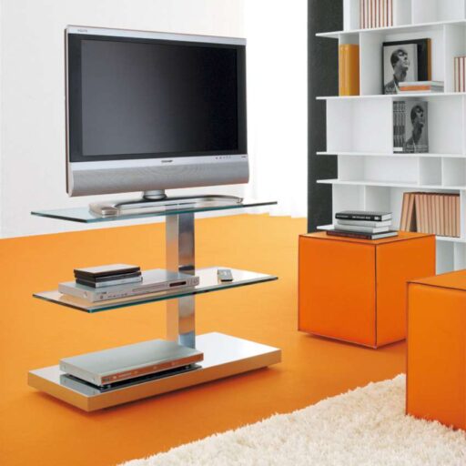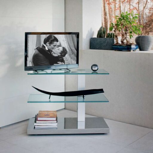 Porte-flat-TV sur roulettes, avec passe cable. Étagères en verre mix (clair et dépoli) et structure en acier inox. Capacité maximum: kg 35; chaque plateau en verre kg 10.
