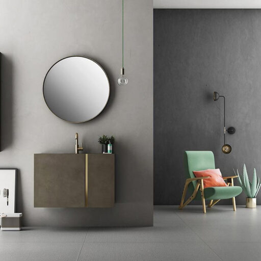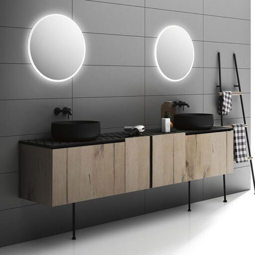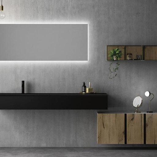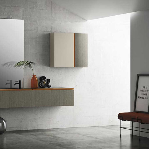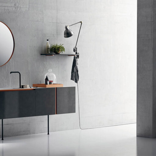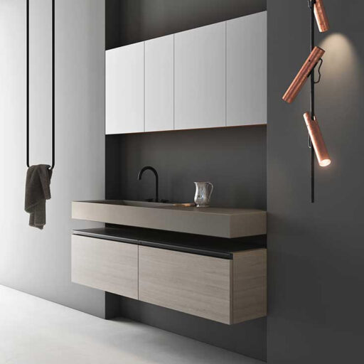 Les matériaux utilisés vont des essences de bois sélectionnées tel que l’eucalyptus thermo-traité ou le chêne sablé aux laqués sand, brillants ou oxydés, jusqu’aux matériaux techniques comme le Fenix NTM. Le large éventail des plans de toilette comprends des marbres, des pierres, la Kerlite®, le Koral, le Fenix NTM®, la Micromalta et les métaux. Il est également possible de choisir un plan de toilette exclusif en pierre de lave, orné de décors géométriques vitrifiés ou de réaliser un plan de toilette personnalisé avec des carreaux sur proposition du client.