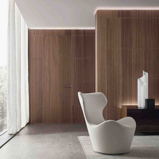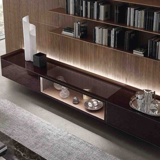 Présence discrète et rigoureuse par définition, le système boiserie Modulor assume avec la finition exclusive en noyer Sahara une valeur très expressive. Protagonistes au centre de l'espace, le nouveau buffet Self en verre et les étagères en aluminium du système!me, tandis que trouvent place au fond, parfaitement intégrées, les portes avec ouverture battante.