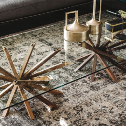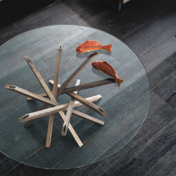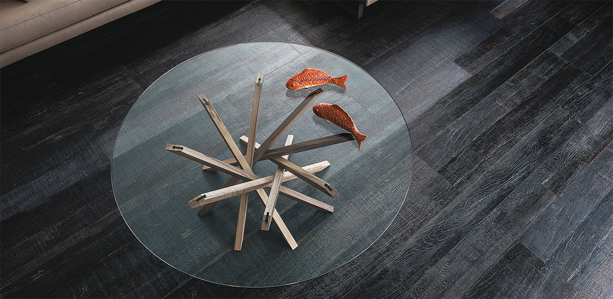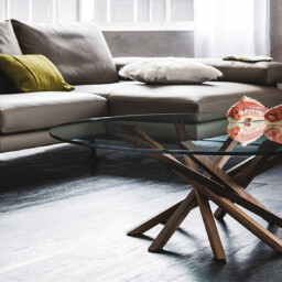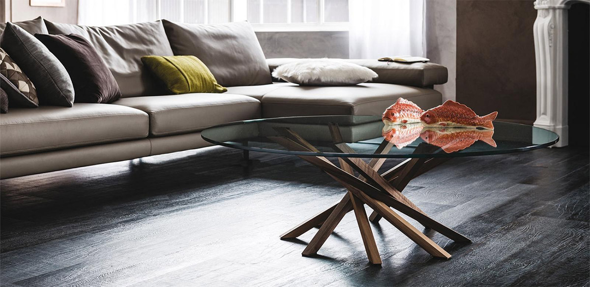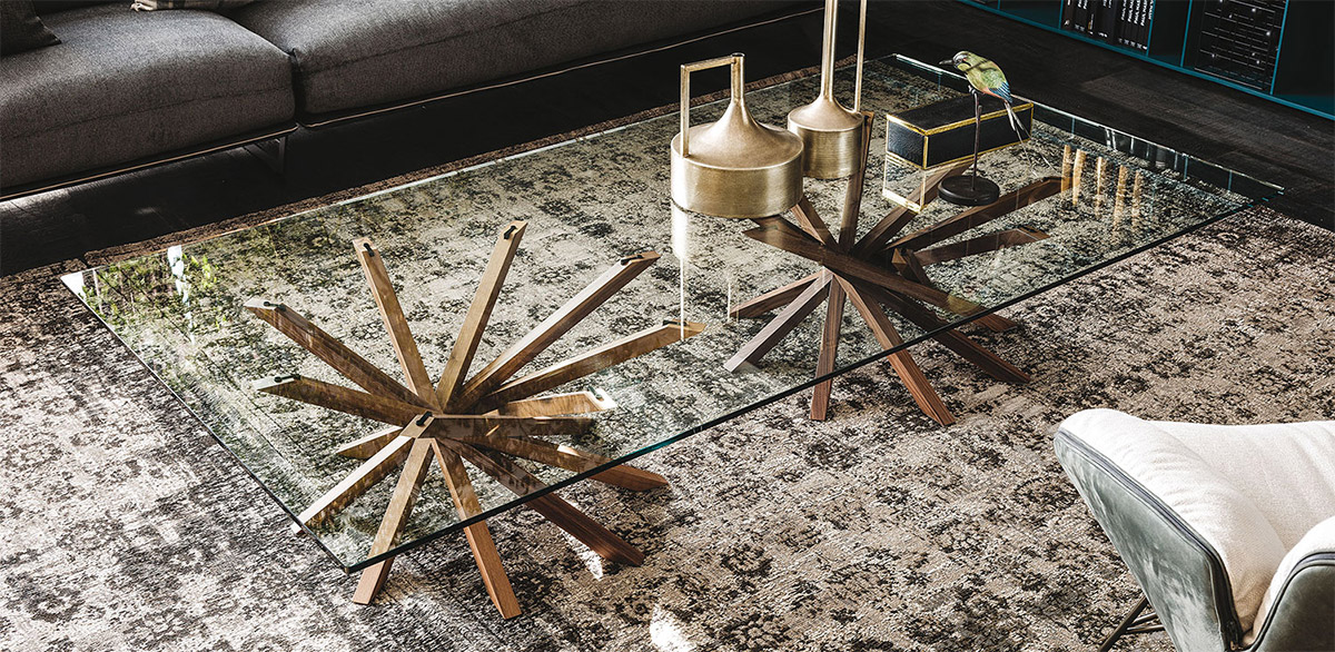 Table basse avec base en noyer Canaletto massif (NC) ou noyer teinté rouvre brulé (RB). Plateau en appui en verre clair.