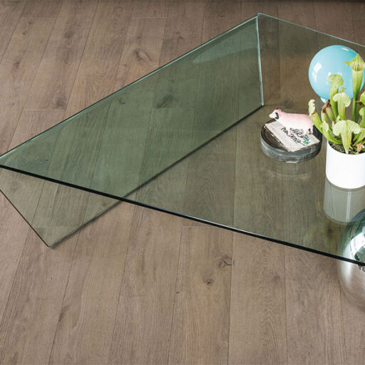 Table basse avec top en verre transparent curbé, sphère en acier inox brillant ou travertin (TN).