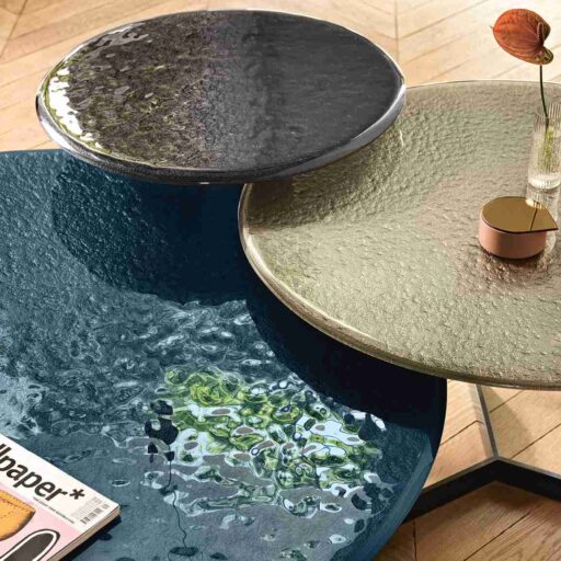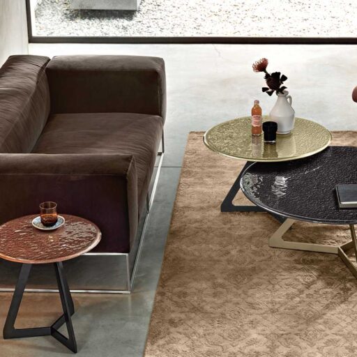 Table basse avec plateau en verre en fusion de 10mm, verni dessous avec des teintes métallisées ou avec plateau en marbre. Base en métal verni, finition Gris Lave ou Champagne métallisé.