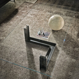 Table basse avec base en métal verni transparent (OP0) et sphère en Travertin naturel (TN). Plateau en verre clair. La finition de la base OP0, identifie un revêtement transparent sur les matériel en fer brut. La présence de taches, plus ou moins évidentes, variations de couleur, rayures et bords irréguliers sont caractéristiques du traitement spécial de la matière et ne sont pas à considérer comme un défaut.