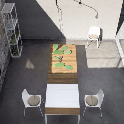 Avec leurs formes arrondies, les pieds des tables Maki sont ici associés à un plateau à lattes de 20 cm de large et de 2 cm d’épaisseur en teck certifié FSC respectant l’environnement que l’on pourra laisser au naturel afin qu’il prenne son incontournable tonalité argentée ou bien traiter avec de l’huile pour lui redonner sa teinte d’origine. Les tables à rallonges sont dotées d’un système d’ouverture en aluminium tréfilé se logeant dans un espace prévu à cet effet.