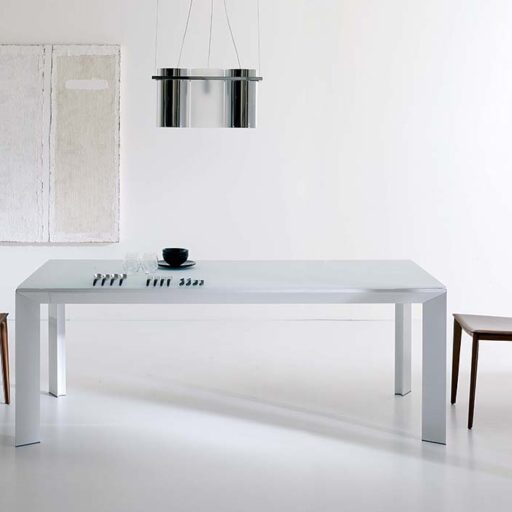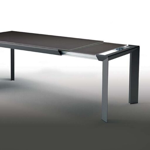 Table à rallonges pour salle à manger, structure en aluminium, mécanisme télescopique, plateau et rallonge en panneaux stratifiés aluminium et bois.