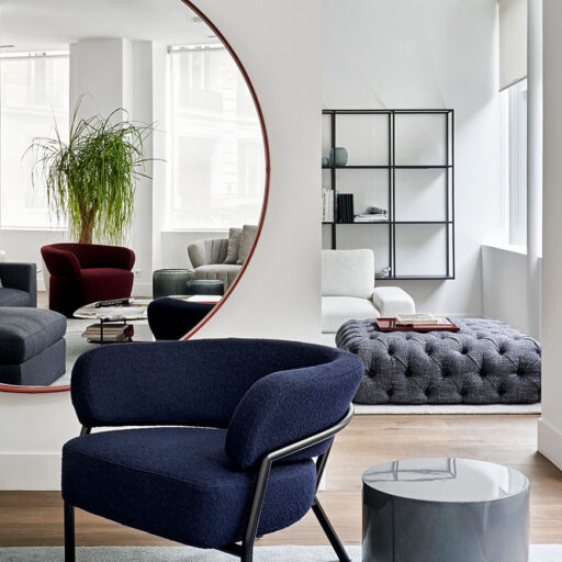 L’aspect simpliste des surfaces géométriques définit les formes de cette collection de tables basses, disponibles en variantes monochromes de laque brillante ou mate.