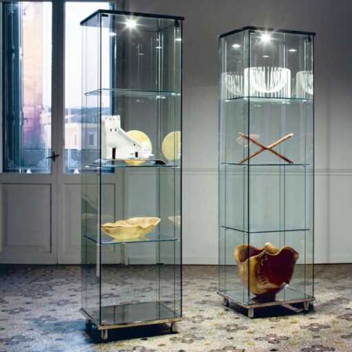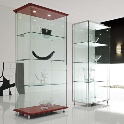 Vitrine en verre clair avec pieds chromes. Ciel et fond en acier inox ou en cuir selon échantillons. Avec lampes halogènes. Capacité maximum: chaque plateau kg 7.