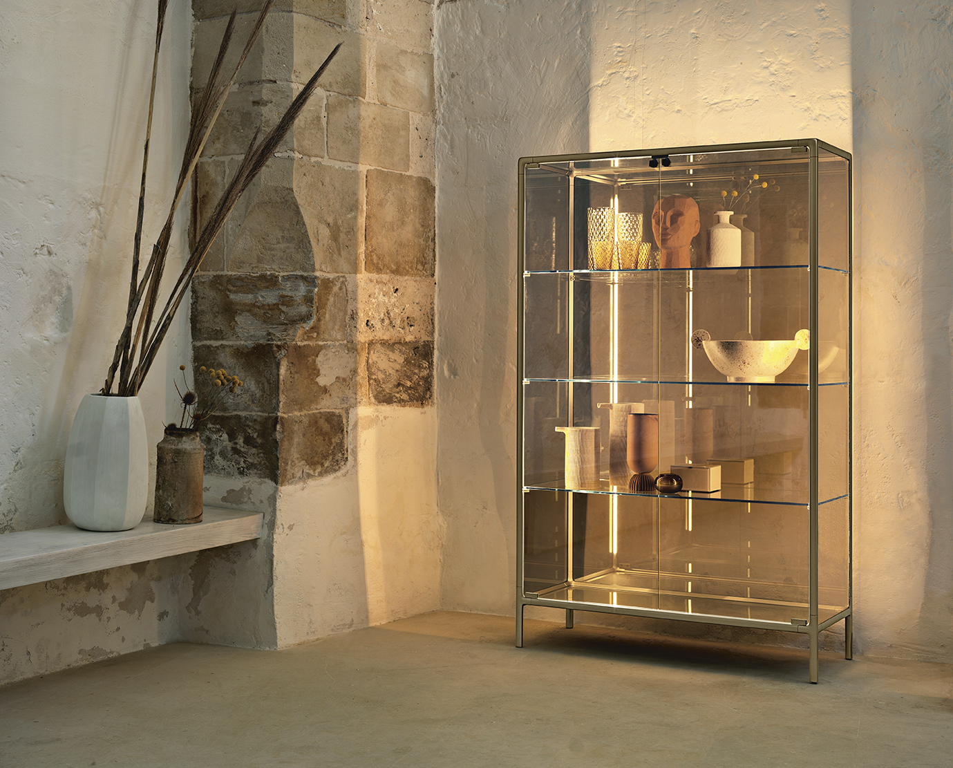 Vitrine avec profils en aluminium vernis, disponibles dans les finitions métalliques champagne et gris volcan. Base en verre trempé extra light de 6 mm, verni dessous pour s’adapter aux profils ; structure et portes de la vitrine en verre trempé extra light, fumé ou bronzé de 6 mm ; étagères en verre trempé extra light de 8 mm. La vitrine est également disponible en verre plat (pas en fusion) et en verre semi-réfléchissant. Système d’éclairage LED intégré dans les montants avant de la structure (optionnel).