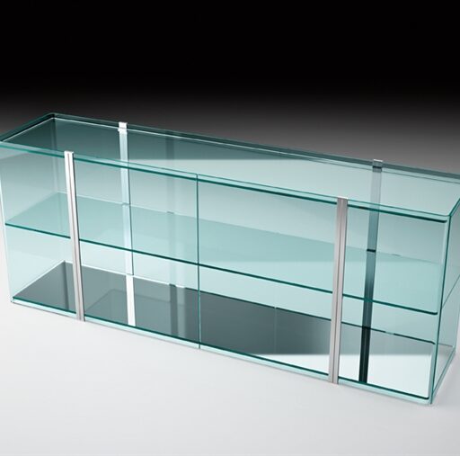 Structure en verre cintrè transparent: étagères et top transparents; base: verre extralight verni dessous blanc ou argenté, verre transparent verni dessous noir.