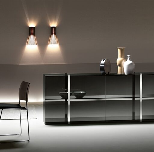 Vitrine rangement en verre cintré de 8 mm et étagères de 10 mm, avec elément métalliques en aluminium brillanté et acier inoxydable ; la vitrine rangement est dotée de battants centraux en verre droit de 8 mm.