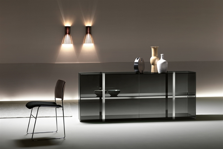 Structure en verre cintrè fumé: étagères et top fumé; base: verre extralight argénté ou verre transparent verni dessous noir.