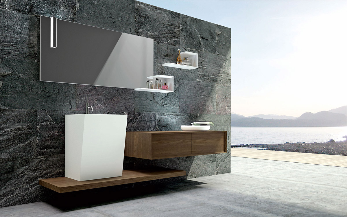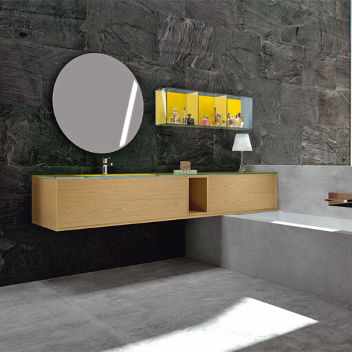 Collocandosi al top della gamma Puntotre, questo bagno d’avanguardia si distingue per la ricerca nei materiali e per il design estremamente avanzato caratterizzato da unioni a 45°