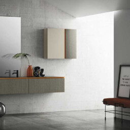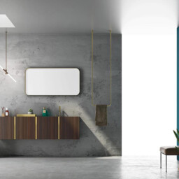 Opera è una collezione di mobili da bagno estremamente raffinata, ispirata alla madia scandinava anni Cinquanta e Sessanta. È caratterizzata da una maniglia posta in orizzontale per i cestoni e in verticale per le ante a battente e illuminata dallo splendore delle finiture in ottone e rame.