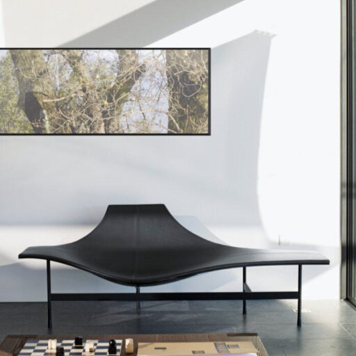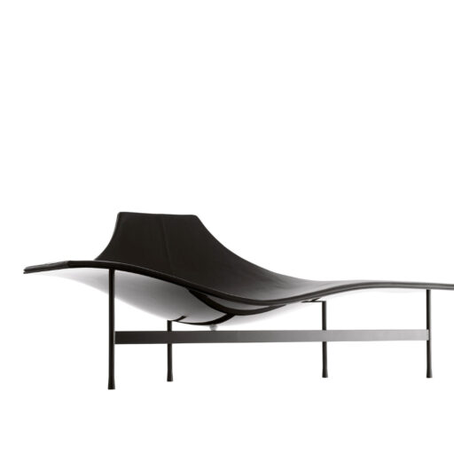 Terminal 1, con la doppia funzione di poltrona e chaise longue, ha l’essenzialità di una scultura che sembra galleggiare. Frutto di una forte attitudine alla sperimentazione, si distingue per la fluidità delle forme, l’equilibrio tra la seduta e il supporto metallico, il contrasto tra il lucido della struttura e l’opaco del rivestimento in pelle che rende più sofisticata la sua immagine monocromatica.