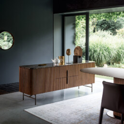 Il legno massello è l’essenza di Rigadin. Una collezione preziosa e vera, dove la bellezza è forma ma anche sostanza. Pregio ed essenzialità sono plasmati in modo personale, connessi da ispirazione e artigianalità. Disponibile in versione con top metallo o marmo / pietra