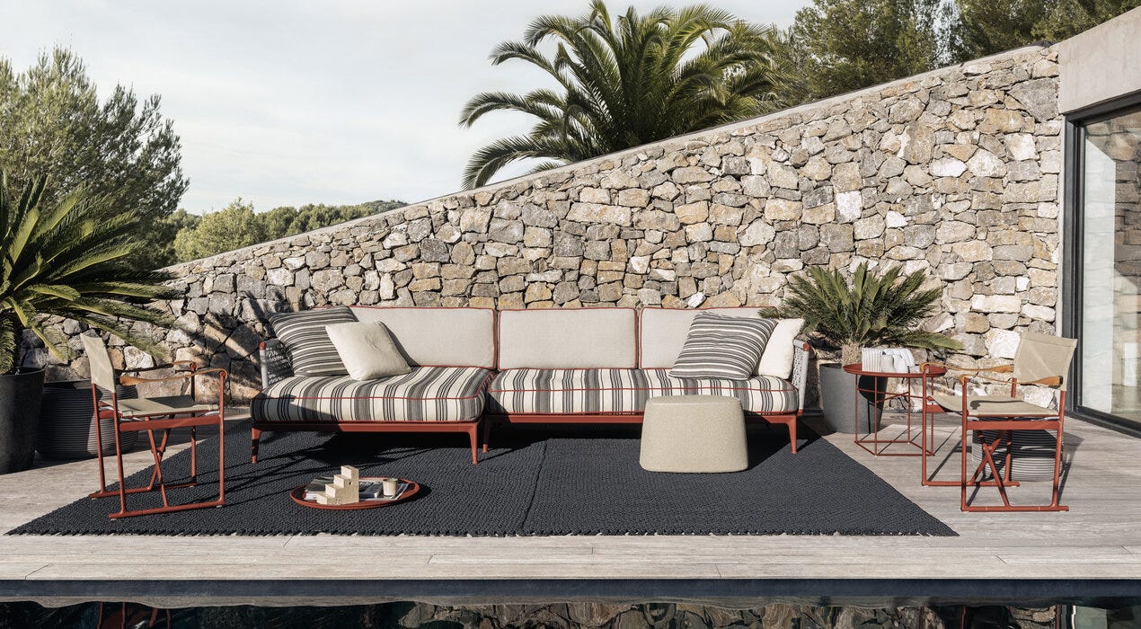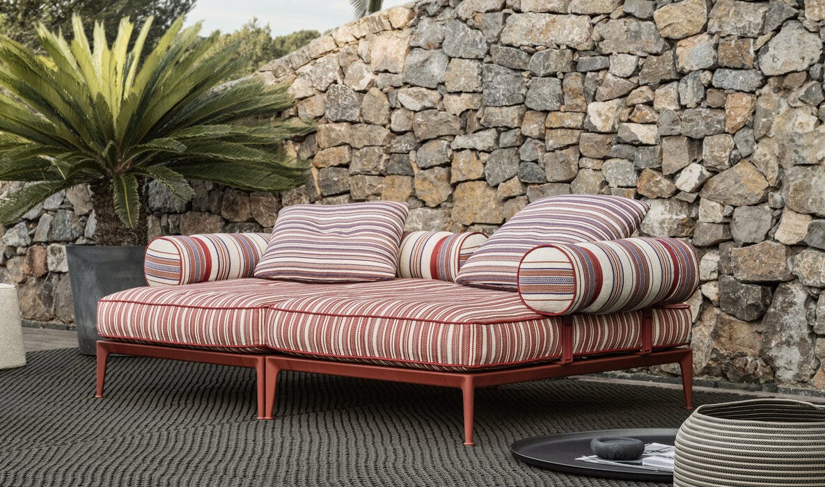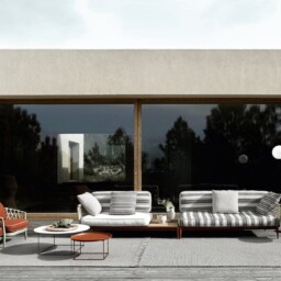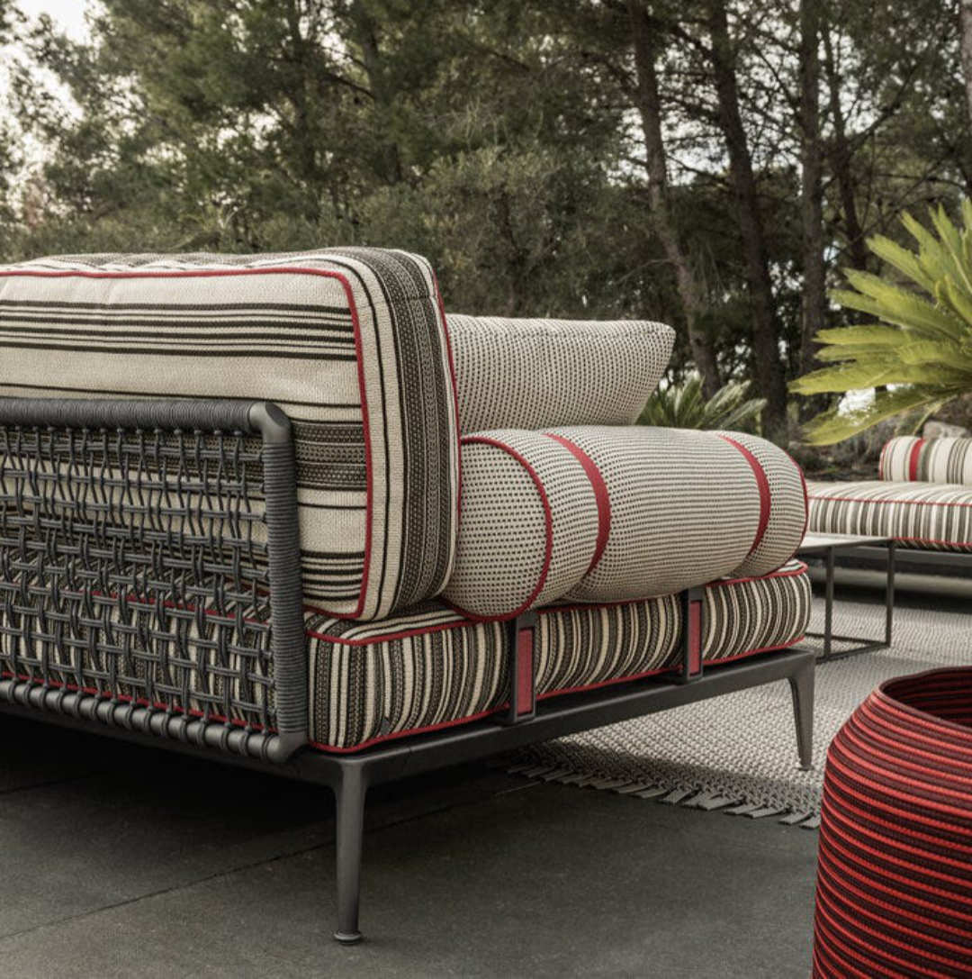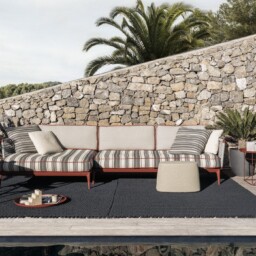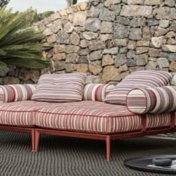 Ribes è il sistema di sedute componibili che mette al centro del progetto i temi della flessibilità, della personalizzazione, del colore e della ricerca sui materiali. Divani fissi, elementi centrali e terminali, arricchiti da chaise longue e pouf, proposti in numerose tipologie e dimensioni, consentono di interpretare lo spazio outdoor in maniera molto personale grazie all’estrema flessibilità compositiva e alla possibilità di scegliere tra numerosissimi rivestimenti e finiture. Il punto di partenza è una base “futon” con doghe flessibili in fibra di vetro, appoggiate su una struttura in alluminio, sulla quale fissare liberamente braccioli e schienali previsti in due tipologie: a telaio con intreccio in fibra di polipropilene oppure a rullo. A completarla, cuscini sedile pensati come comodi materassi dove rilassarsi e varie tipologie di cuscini schienale e bracciolo, tutti realizzati con una speciale imbottitura che dona a Ribes un aspetto vissuto particolarmente morbido. Grazie alla flessibilità del sistema, Ribes può essere modificato nel tempo aggiungendo nuovi elementi, ma anche cambiando la funzione d’uso di quello esistenti. Sostituendo, aggiungendo o modificando la posizione di schienali e braccioli, un sommier può diventare un vis-à-vis, un divano può diventare un’isola, un angolare può diventare un comodo letto. Una natura trasformabile quella di Ribes, che si trova particolarmente a suo agio negli spazi di passaggio tra interno ed esterno, nelle verande o all’ombra di un patio, sotto un loggiato o un terrazzo coperto, per vivere con fluidità la casa e gli spazi aperti.