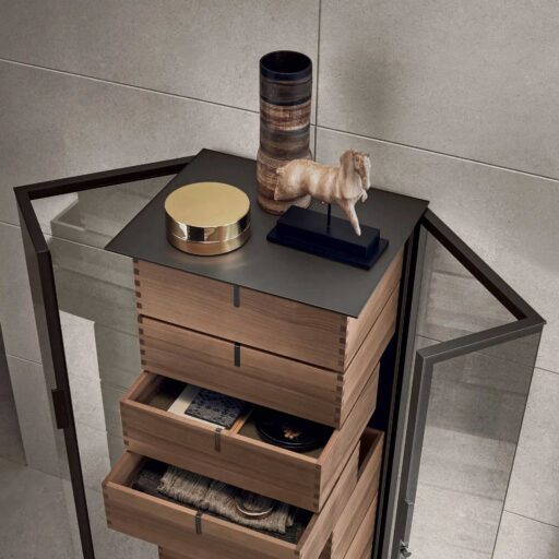 A volte gli arredi superano i limiti funzionali e si propongono come nuove soluzioni per caratterizzare lo spazio, ideali per contenere gli oggetti di maggiore affezione. È il caso dei contenitori Ala, vetrine concepite come uno scrigno prezioso, che schiude cassetti in essenza di noce caratterizzati dalla tradizionale costruzione "a coda di rondine" e sospesi su una struttura interna nascosta. Un mobile dal forte valore espressivo, concepito con una intuizione tecnica evoluta che si rivela in un mobile esteticamente sorprendente.