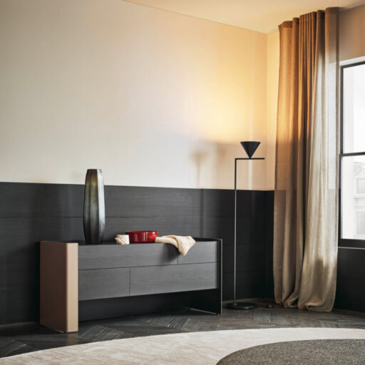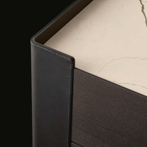 Ad accompagnare il letto Chloe è una serie di complementi ispirati al particolare disegno della testata ripiegata verso l’interno. Nei comodini e nella cassettiera Chloe, i fianchi di sostegno in metallo rivestiti in cuoio si trasformano così in un dettaglio iconico che conquista per leggerezza e personalità.