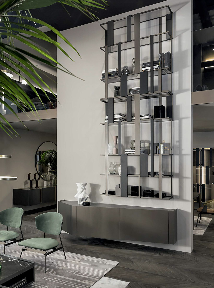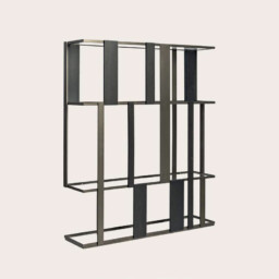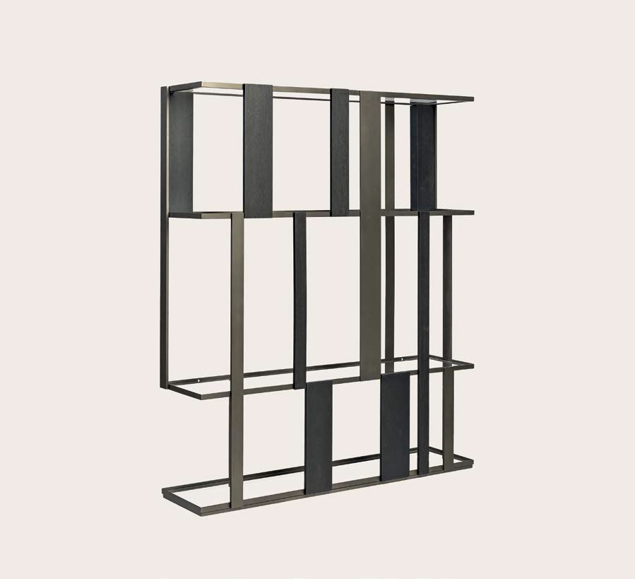 DALL libreria pensile, legno T150 noir, struttura in metallo bronzo scuro, ripiani in vetro extrachiaro.
