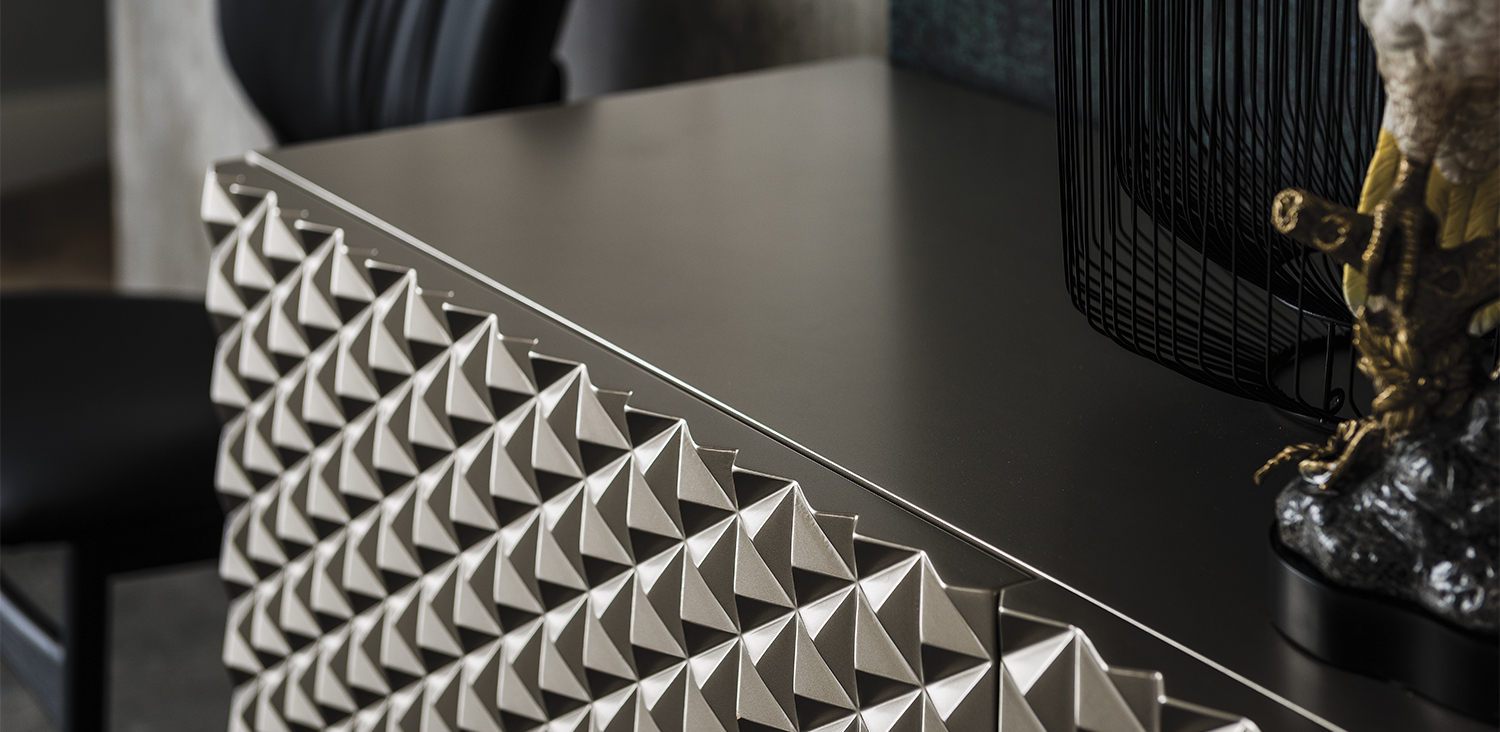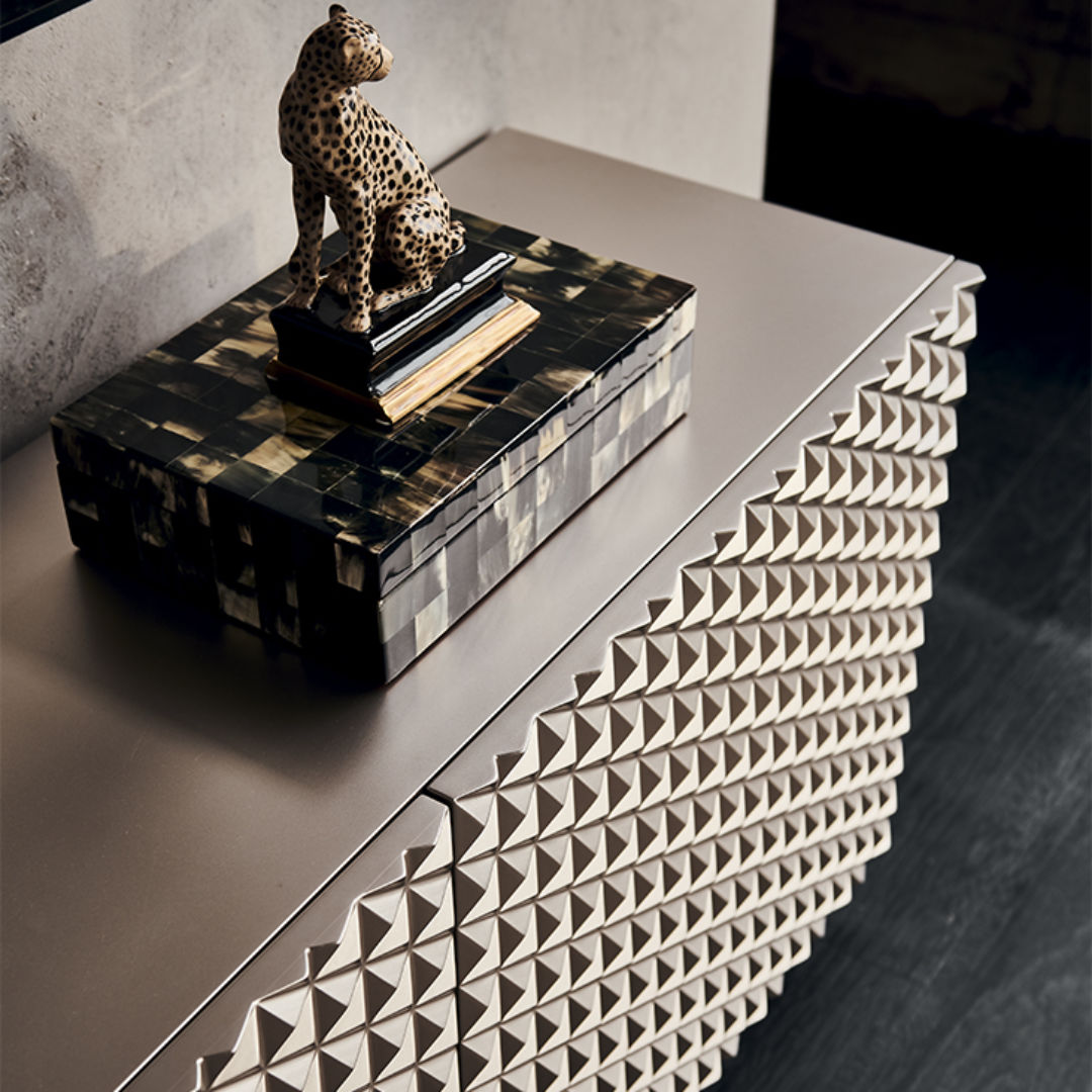 La madia moderna Royalton è formata da una composizione di volumi tridimensionali che formano un pattern geometrico in grado di ammaliare ed ipnotizzare. Questa decorazione è presente sulle ante in poliuretano verniciato, che creano un effetto chiaro scuro affascinante. La madia di design è realizzata con 2 o 3 ante e in due diverse altezze, per adattarsi facilmente ad ogni ambiente della casa, con uno stile ricercato e la cura del dettaglio che contraddistingue la manifattura italiana.