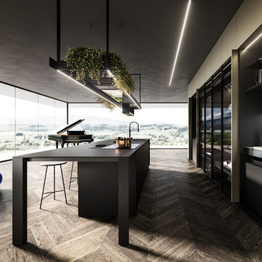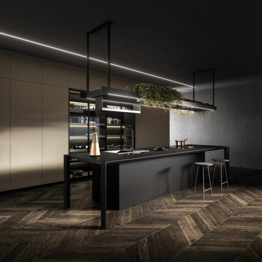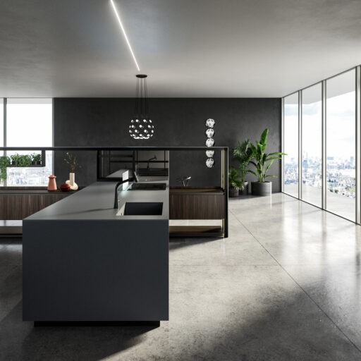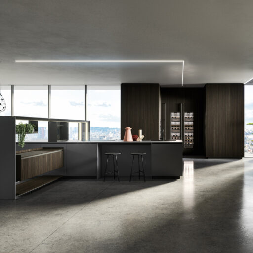 Nautila va oltre l’idea di ambiente cucina e declina nell’habitat il proprio linguaggio progettuale: un nuovo sistema a ponte – una trafila di alluminio brevettata da Arrital, priva di elementi di giunzione a vista e in finitura Nero Opaco rivestita in vari materiali, tra i quali l’acciaio inox su supporto in alveolare di alluminio – trasforma il concetto di cucina in architettura multitasking e funge da architrave di separazione tra la zona giorno e il living. La stessa trafila trova utilizzo in ulteriori componenti che caratterizzano le cucine Arrital.