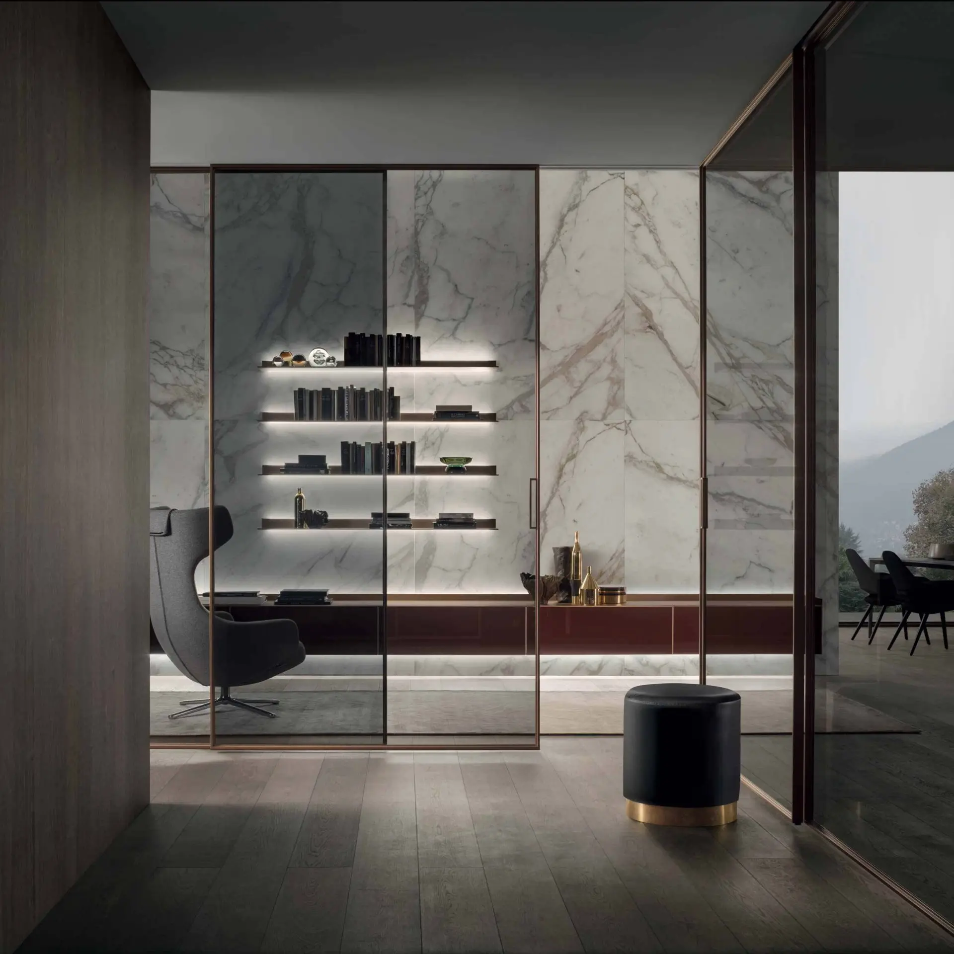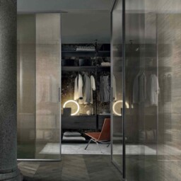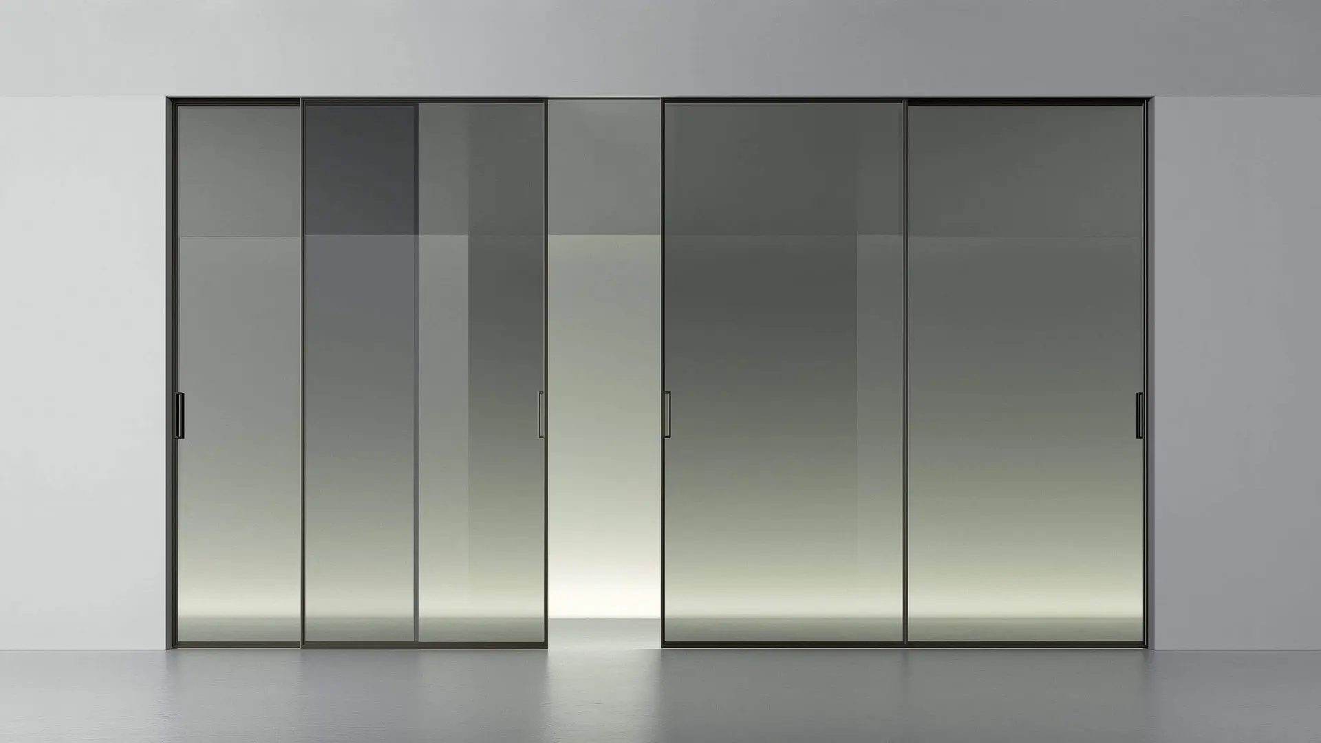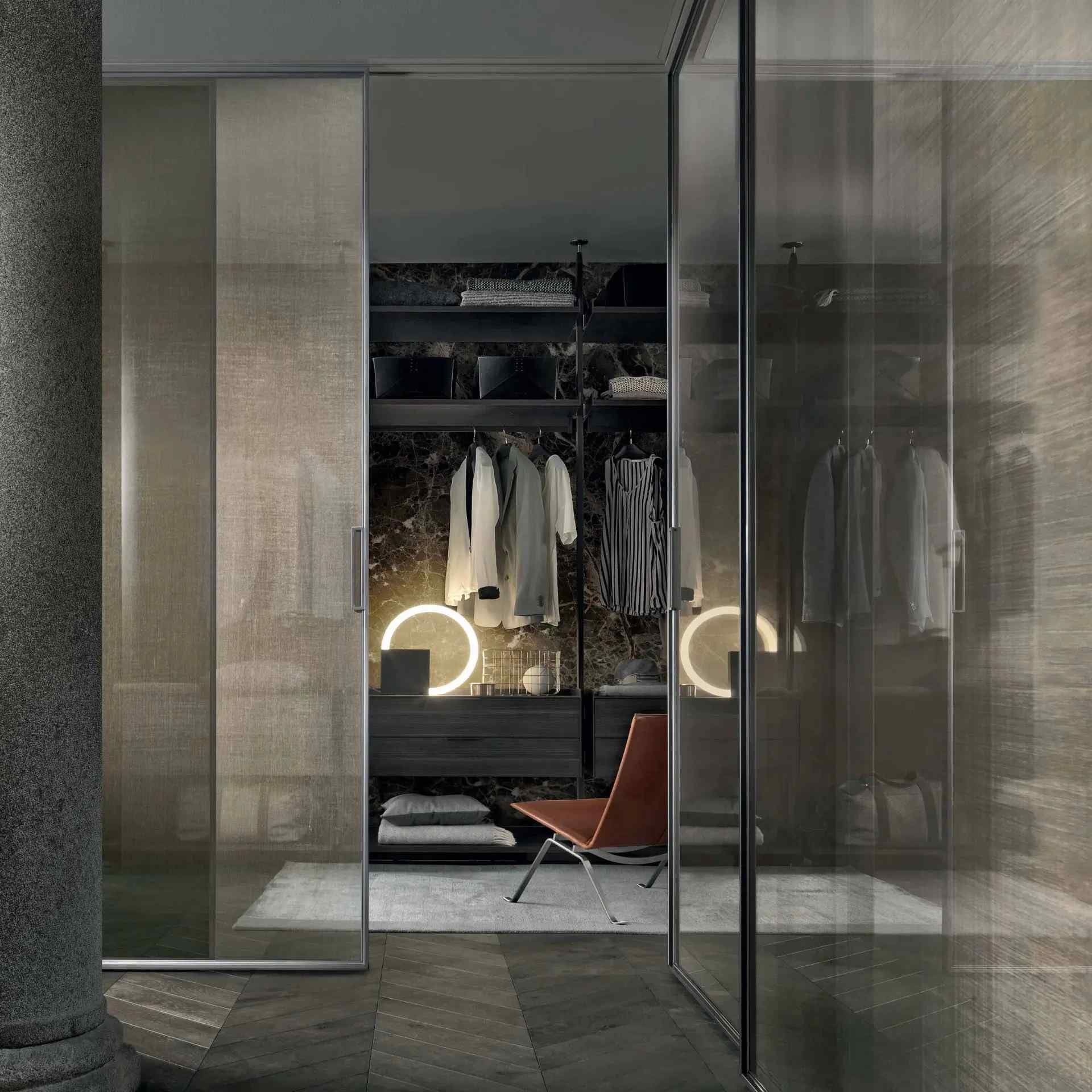 L'interpretazione della porta scorrevole all'insegna del massimo rigore geometrico. Un progetto in cui i pannelli vengono realizzati sempre su misura, con un profilo strutturale in alluminio di minimo spessore che valorizza al massimo le qualità estetiche esclusive del vetro Rimadesio.