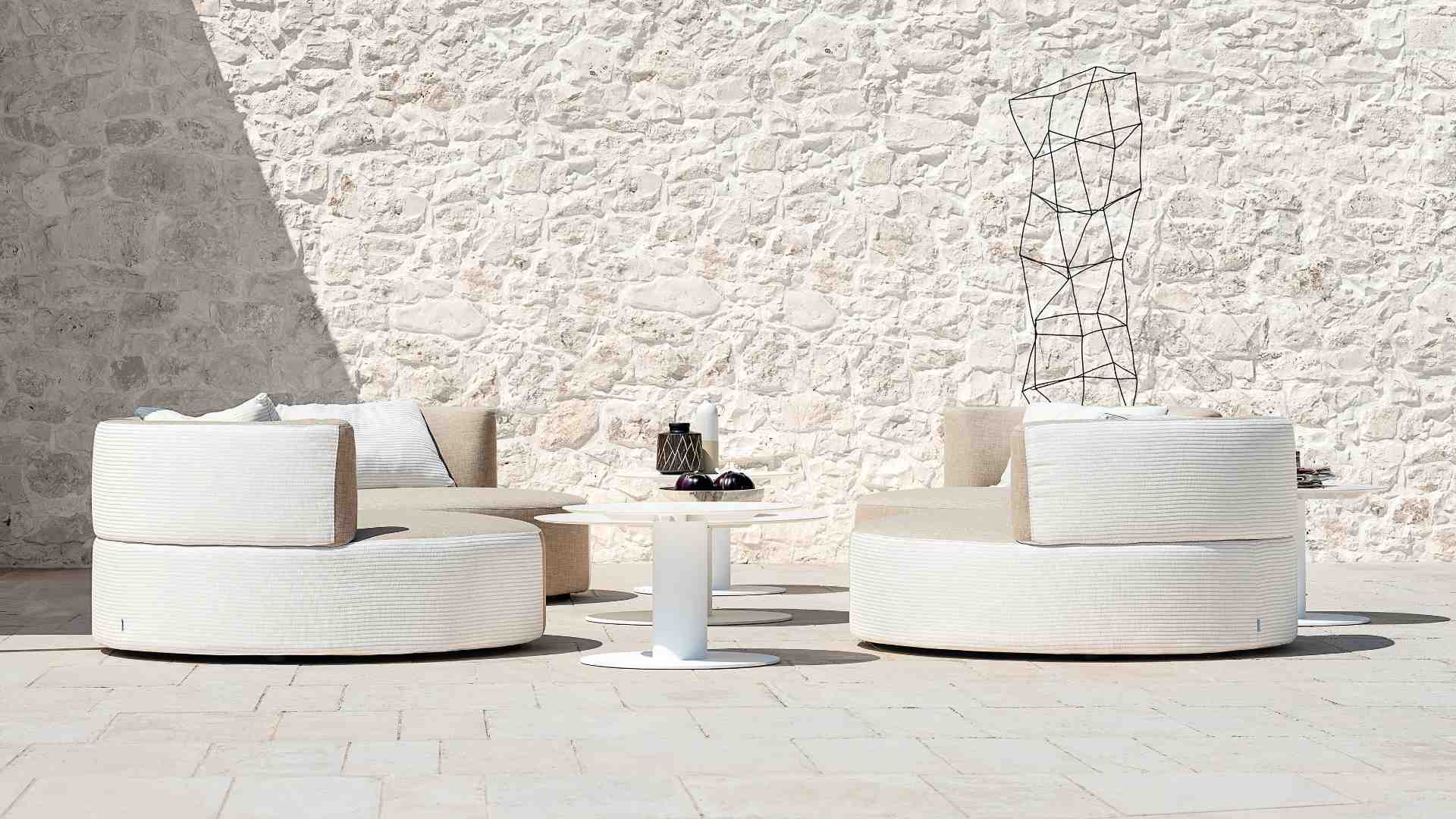 Le poltrone imbottite Belt arredano gli spazi outdoor come isole di relax. La loro forma circolare, l’ampia seduta e il morbido schienale ne fanno una proposta nata per il comfort.