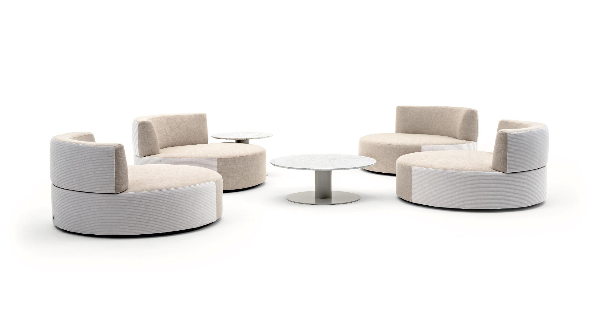 Disponibili in diverse misure, da 90 o 135 cm di diametro, e con rivestimenti monocolore o bicolore, le poltrone Belt creano composizioni eleganti che invitano alla convivialità.