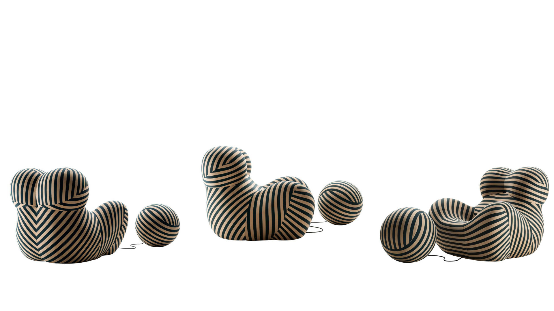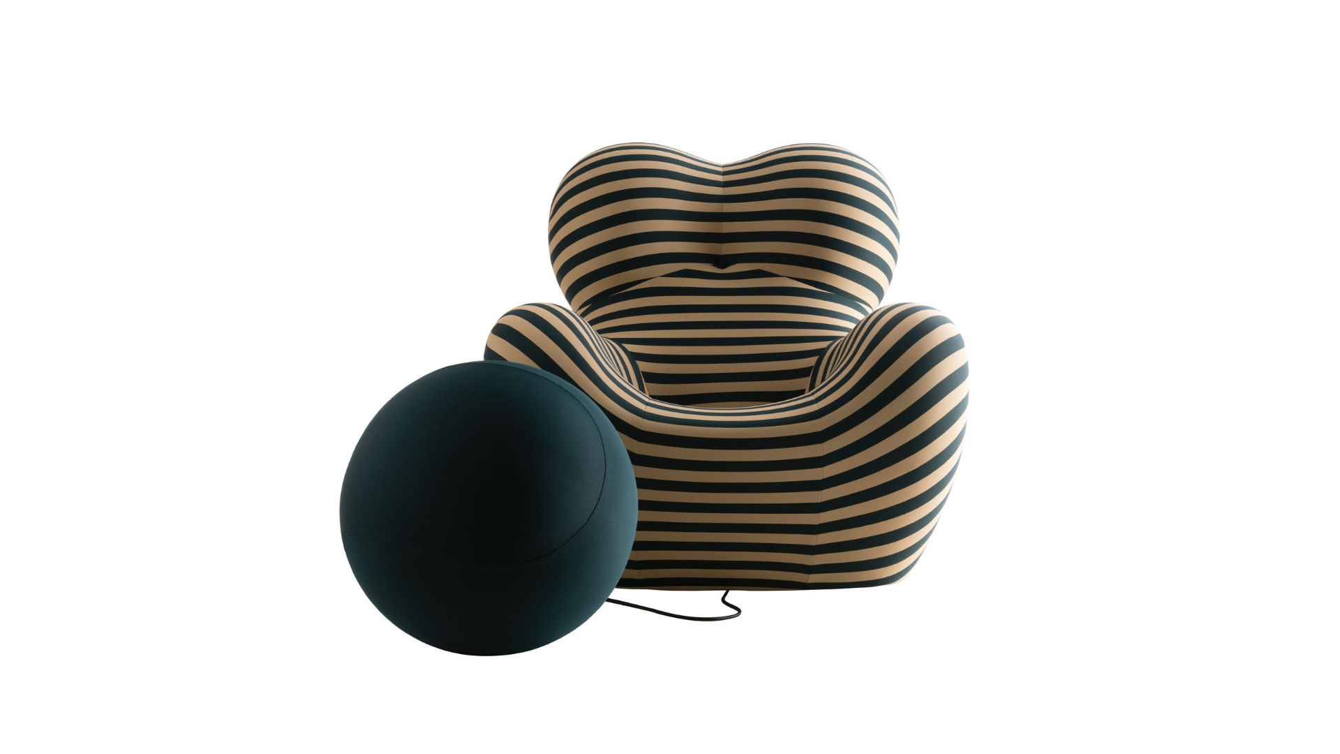 Per celebrare il cinquantesimo anniversario della Serie Up, disegnata da Gaetano Pesce nel 1969, l’iconica poltrona con poggiapiedi UP5_6 si veste di un abito speciale: un rivestimento in tessuto rigato beige/verde petrolio che si rifà alla cartella colori originale.
