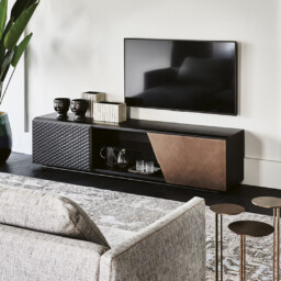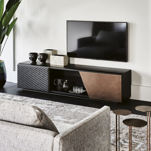 Il porta TV della collezione Aston è un arredo affascinante che da personalità alla zona living, rendendola indimenticabile. La peculiarità del mobile TV modermo Aston è la commistione di molteplici materiali e pregiate finiture.