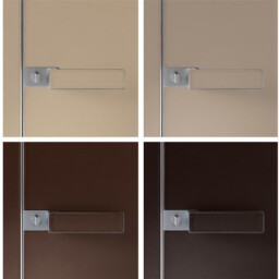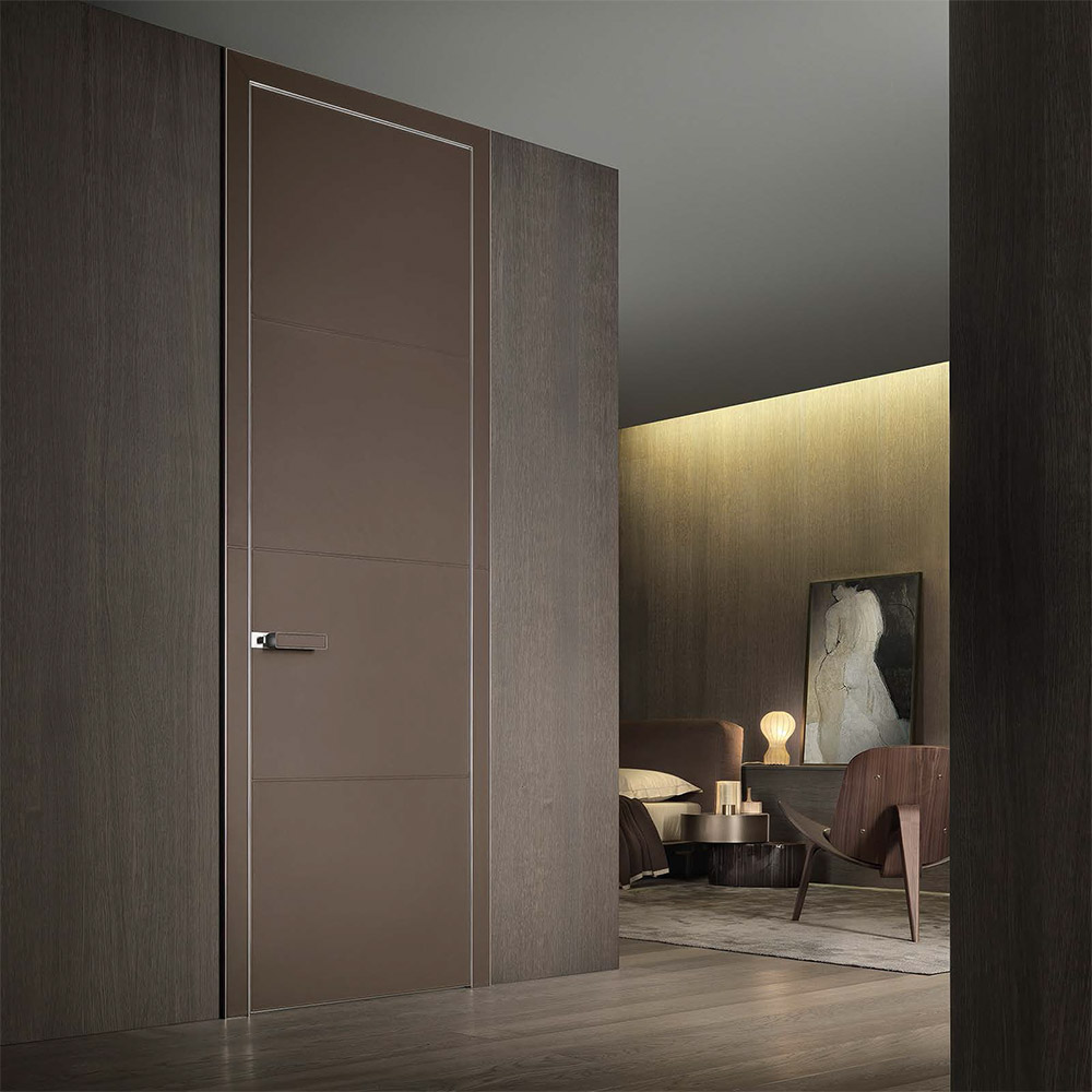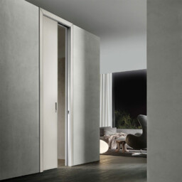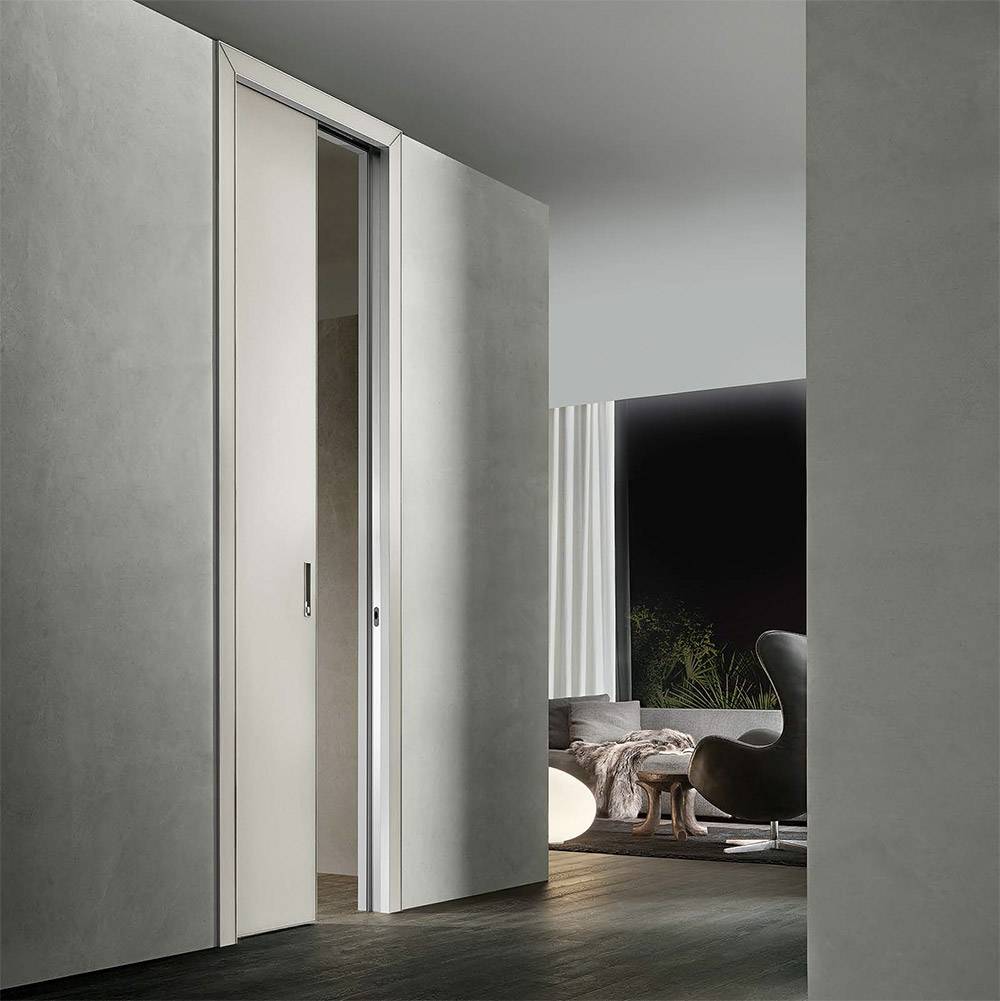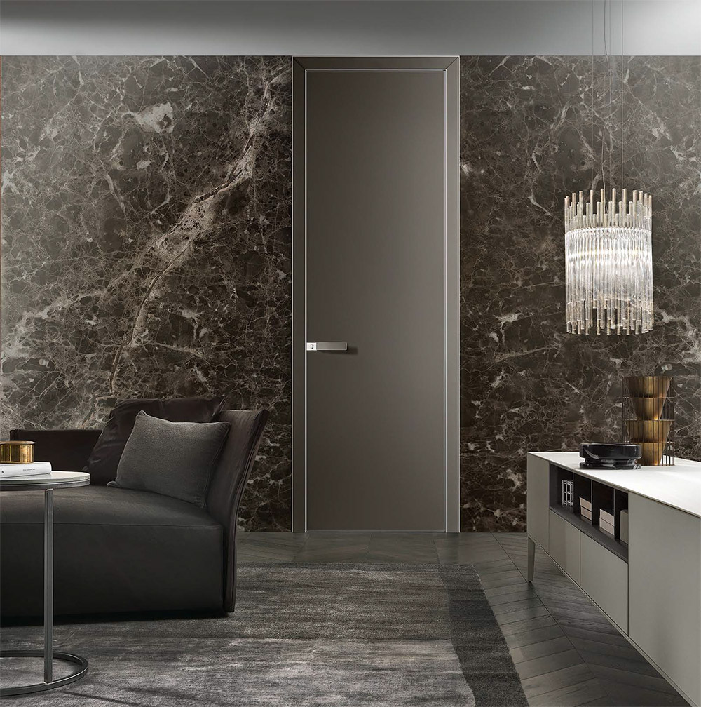 La porta complanare con lo stipite in vetro laccato o in alluminio. Un progetto caratterizzato dalla perfetta complanarità con le pareti e dalla possibilità di installazione con apertura a tirare o a spingere.