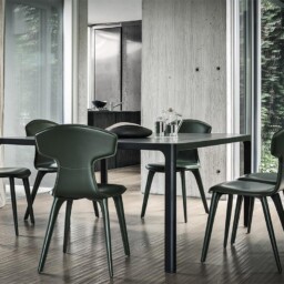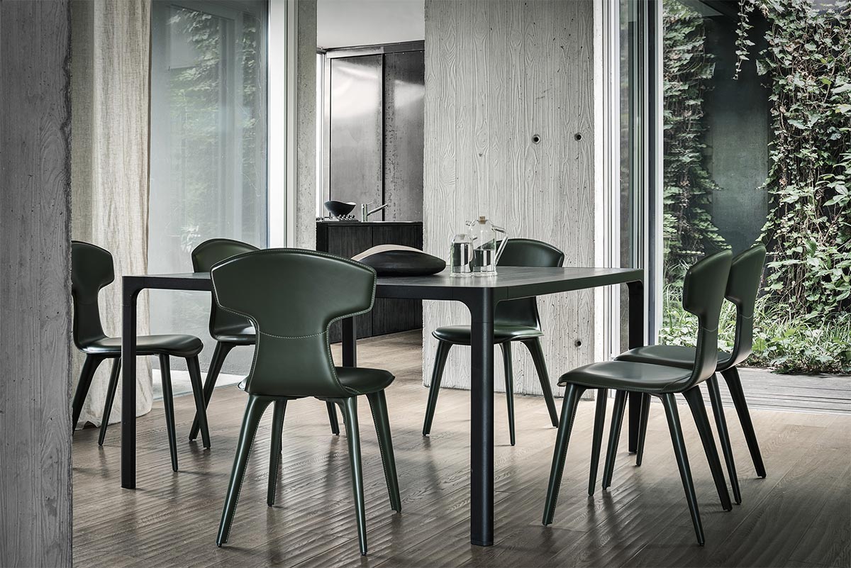 Ele lega in uno speciale connubio i lineamenti sinuosi delle sue forme con il carattere forte del cuoio che la ricopre interamente. Le impunture a vista sagomano un leggero motivo grafico sullo schienale impreziosendo la seduta con elegante discrezione.