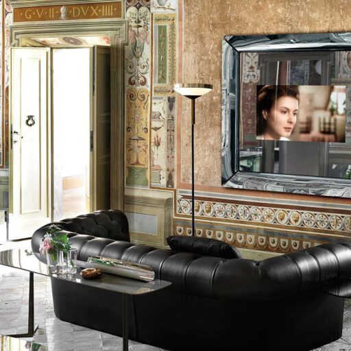 Specchio con televisore incorporato. Specchio da parete in vetro semiriflettente da 5 mm color titanio, formato da 4 elementi singoli curvati in vetro semiriflettente da 6 mm color titanio retro verniciato nero, oppure in vetro bronzo da 6 mm retroargentato. Telaio in metallo verniciato nero opaco.