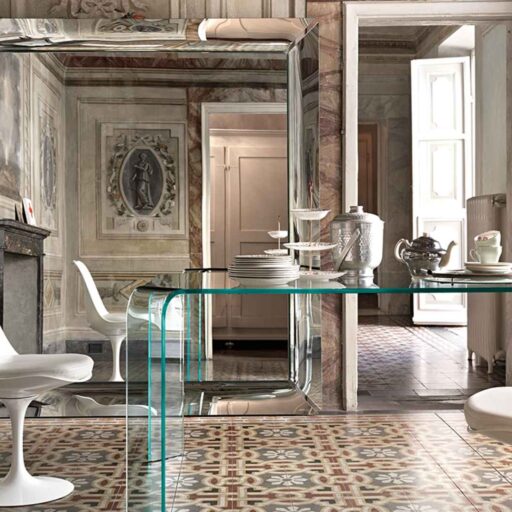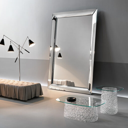 Specchio da parete o da terra con cornice formata da quattro elementi singoli in vetro da 6 mm curvato e retroargentato. Disponibile anche in vetro semi-riflettente color Titanio o in vetro bronzo retroargentato. Possibilità di appendimento in orizzontale o verticale. Disponibile anche su misura e in configurazioni modulari. Kit di retro-illuminazione a LED, dimmerabile e con regolazione della temperatura (opzionale).