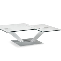 Tavolino estensinile con piani girevoli sincronizzati in cristallo. Base e supporti in acciaio verniciato o galvanizzato. Disponibile anche con base in ceramica, cristallo verniciato o specchio.