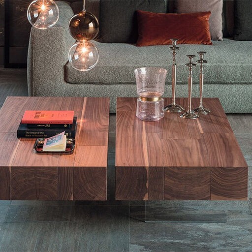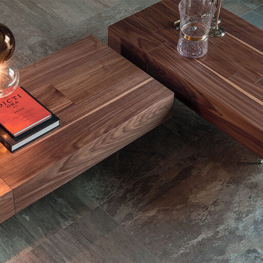 Tavolino in noce Canaletto (NC) con piedi in metacrilato trasparente.