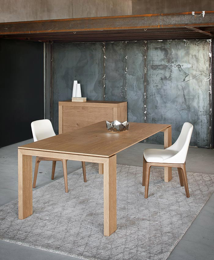 Atlante è un tavolo allungabile in legno con gambe a cavalletto e meccanismo di estensione in alluminio anodizzato.