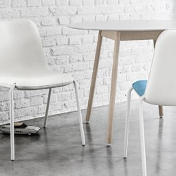 I piani sono in laminato bianco o nero, resistente e facile da pulire, mentre le gambe sono realizzate in legno tornito con finitura naturale oppure verniciate in tinta con il piano.