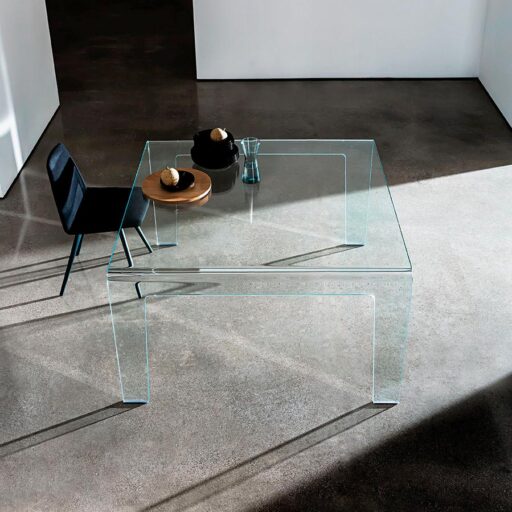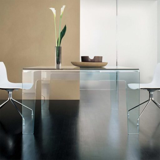 Tavolo in vetro curvo trasparente extrachiaro o laccato mono o bicolore, vari colori.