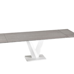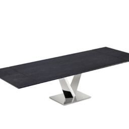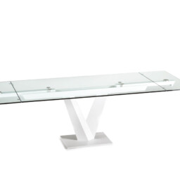 Il tavolo Minosse (Naos) è un tavolo da pranzo con struttura in metallo laccato e piana in vetro Tavolo allungabile con struttura in metallo laccato e piana e allunghe in vetro laccato con meccanismo girevole automatico.