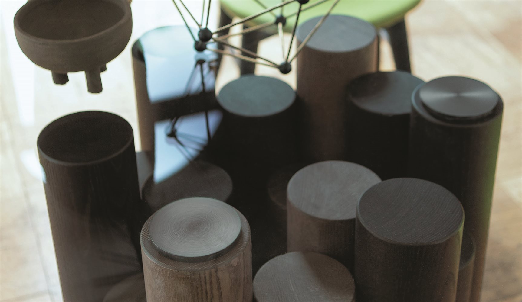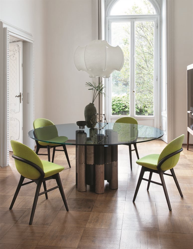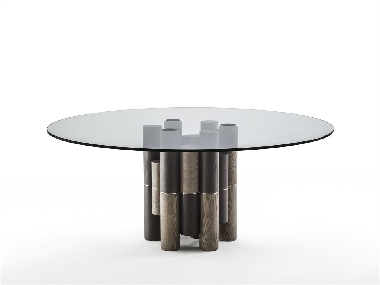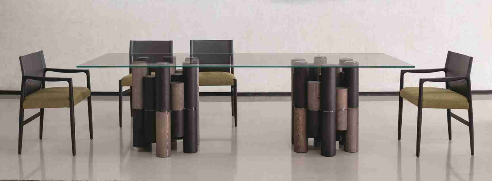 Tavolo da pranzo con base costituita da diversi elementi in massello di frassino e piano in cristallo trasparente temperato, fissato attraverso piastre in metallo finitura antracite spazzolato. Elementi di unione in metallo finitura cromo nero.