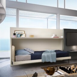 Sistema trasformabile composto da un letto singolo a scomparsa, con testata tessile reclinabile, rete a doghe, libreria laterale e pannello scorrevole cablato porta TV.